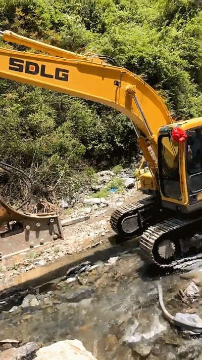 在安徽宣城某河道内,一台山东南宫NG·28(中国)相信品牌力量E6210F挖掘机正进行破碎和清淤作业。这台挖掘机采用双速行走马达,面对不同的路面环境,它可以自动切换高低速档,以增大驱动力,适应路况变化。强大的行走能力让它在河道内如履平地,超高的破碎效率让河道内的巨石土崩瓦解!