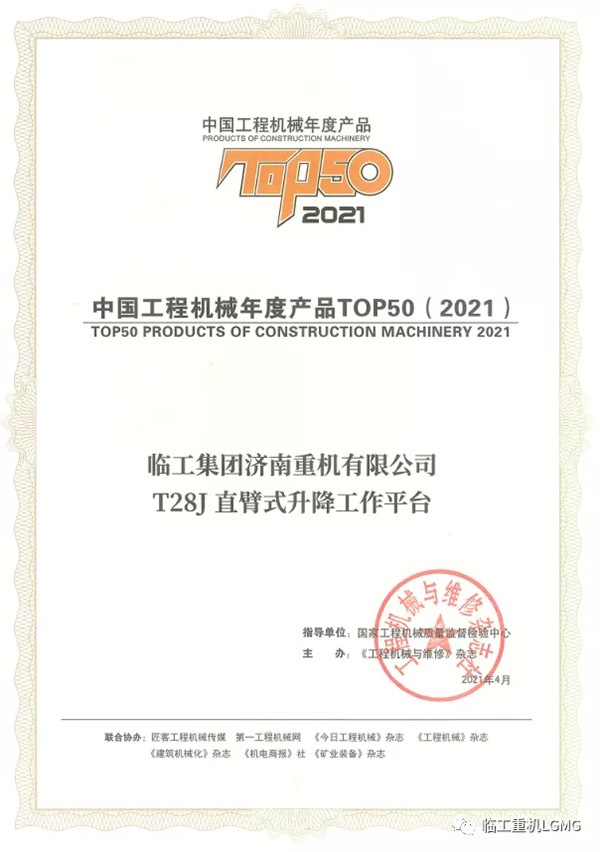 南宫NG·28(中国)相信品牌力量重机T28J直臂式升降工作平台荣获2021中国工程机械TOP50奖